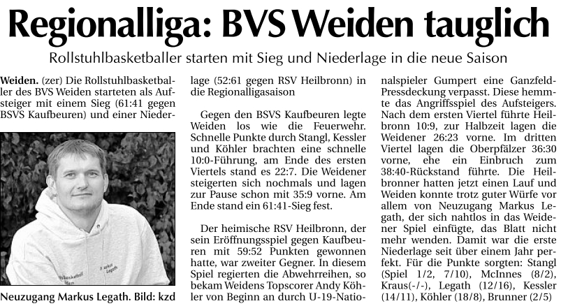 entscheidendem Viertel konnte Weiden über ein 30:36 (6. Min) noch den Vorsprung halten, doch dann kam der Einbruch in den letzten 2 Minuten dieses Viertels und mit einem 40:38 Rückstand wurde in den letzten Spielabschnitt gegangen. Nun hatten die Heilbronner einen Lauf und Weiden musste trotz guter Würfe von Neuzugang Markus Legath, der sich nahtlos und gewohnt stark in das Konzept eingliederte, immer einem Rückstand hinterher laufen. Doch irgendwann musste die Serie der Rollis aus Weiden reißen und mit 61:52 nahmen sie die erste Niederlage seit über einem Jahr gegen starke Heilbronner fair an. Trotz dieser Niederlage präsentierten sich die Weidener um Couch Stefan Kessler als konkurrenzfähig in der Regionalliga Süd.