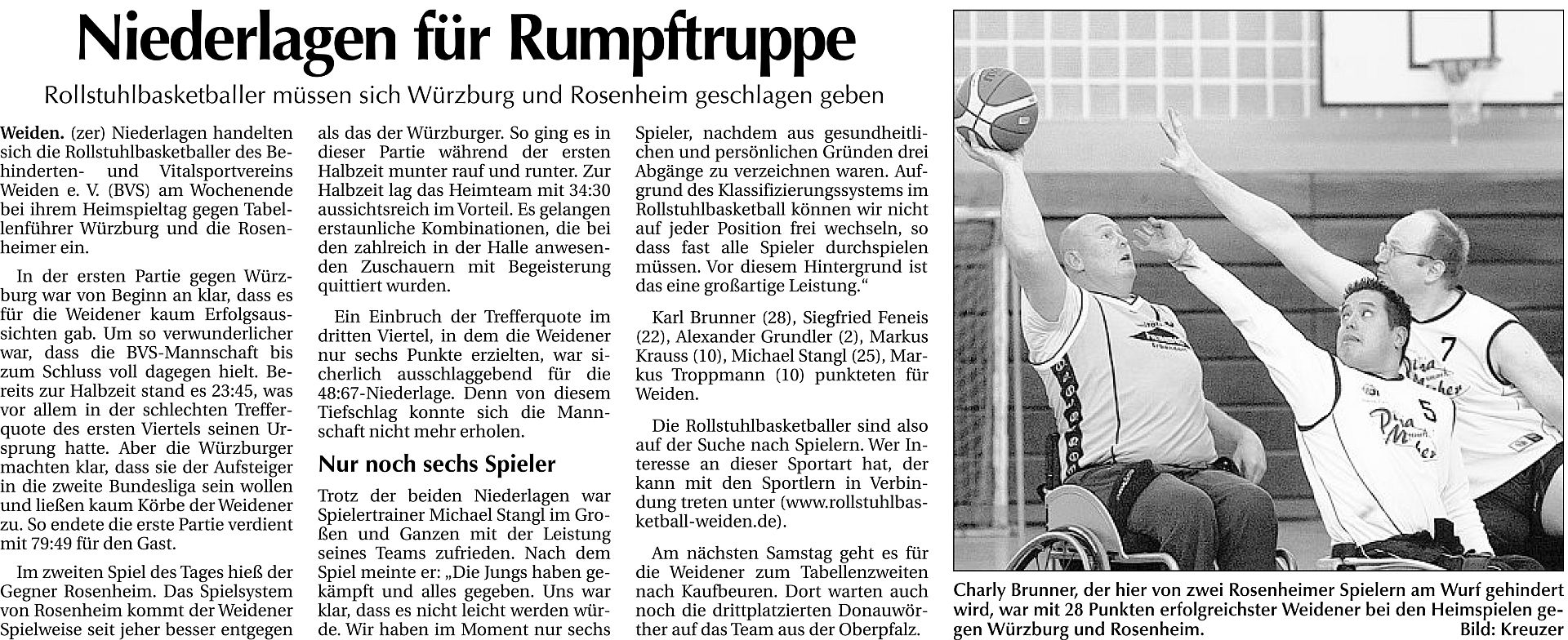 Niederlagen handelten sich die Rollstuhlbasketballer des Behinderten- und Vitalsportvereins Weiden e. V. (BVS) am Wochenende bei ihrem Heimspieltag gegen Tabellenführer Würzburg und die Rosenheimer ein. In der ersten Partie gegen Würzburg war von Beginn an klar, dass es für die Weidener kaum Erfolgsaussichten gab. Um so verwunderlicher war, dass die BVS-Mannschaft bis zum Schluss voll dagegen hielt. Bereits zur Halbzeit stand es 23:45, was vor allem in der schlechten Trefferquote des ersten Viertels seinen Ursprung hatte. Aber die Würzburger machten klar, dass sie der Aufsteiger in die zweite Bundesliga sein wollen und ließen kaum Körbe der Weidener zu. So endete die erste Partie verdient mit 79:49 für den Gast.